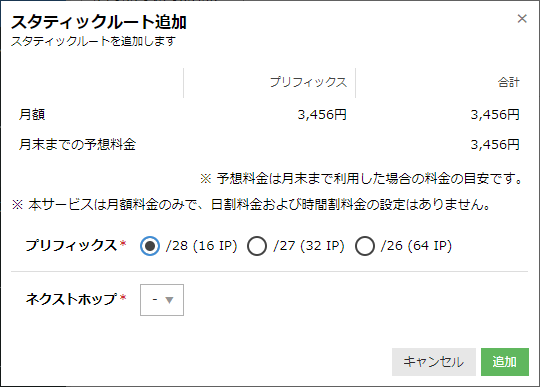 追加したいIPアドレスブロックのプリフィクス、ネクストホップを選択する画面が表示されます。プリフィクスは/28(16IPアドレス)、/27(32IPアドレス)、/26(64IPアドレス)の3段階から、ネクストホップはルータ+スイッチ作成時に付属するIPアドレスの中からいずれかを選択し、「追加」ボタンをクリックします。