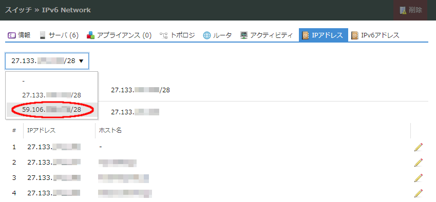 追加が完了すると「IPアドレス」タブ選択画面上部に表示されるIPアドレスブロック選択ポップアップメニューに今回追加されたIPアドレスブロックが表示されます。