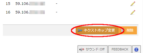 スタティックルート機能で追加されたIPアドレスブロックの一覧画面では、右下に「ネクストホップ変更」ボタンが表示されます。