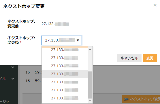 このボタンをクリックするとネクストホップ設定画面が表示され、「ネクストホップ: 変更後」欄のポップアップメニューから変更したいIPアドレスを選択し、「変更」ボタンをクリックすることで変更されます。