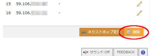 削除したいIPアドレスブロックの一覧画面の右下に表示される「削除」ボタンをクリックします。