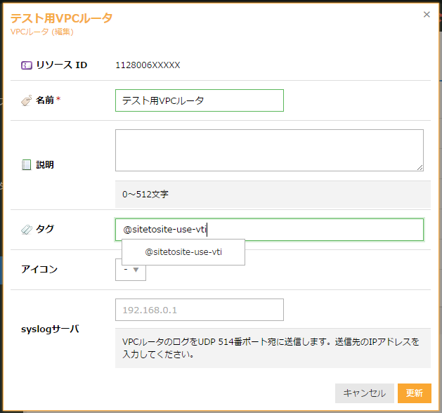 特殊タグの設定は、対象となるVPCルータの情報画面右下の「編集」ボタンをクリックして表示されるVPCルータ情報変更ダイアログボックスの「タグ」入力欄に各特殊タグを入力し、Enterキーを押下することで行います。詳しい利用方法は タグ機能 のページを参照ください。