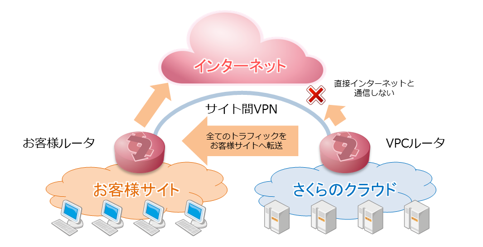 閉域接続機能とは、クラウド環境内のトラフィックを直接インターネットと通信させず、IPsecにより暗号化された経路を通してお客様手元のネットワーク内ルータを介して接続する機能です。