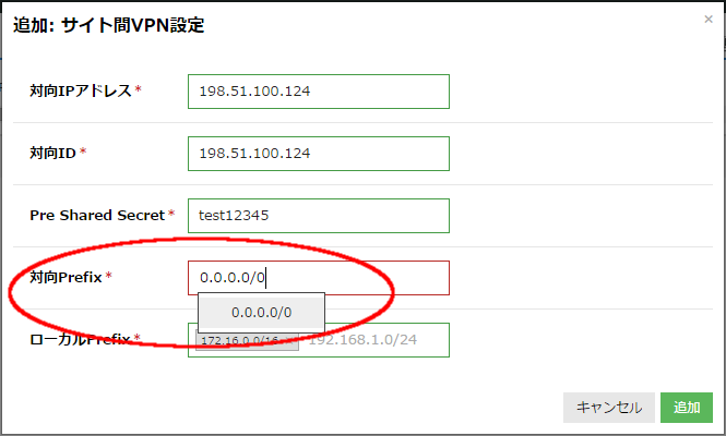 - サイト間VPNのいずれか1サイトのみに、対向Prefixとして0.0.0.0/0を設定できます(同一Prefixを複数サイトに記入した場合はエラーとなります)。