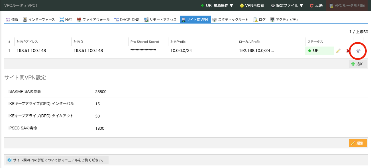 | ステータスが「UP」であるか | 「UP」以外の表示の場合、お客様側機器とサイト間VPN接続がされていない状態です。 サイト間VPN設定画面の各パラメータ、お客様側機器の設定が正しいか再度ご確認ください。 |