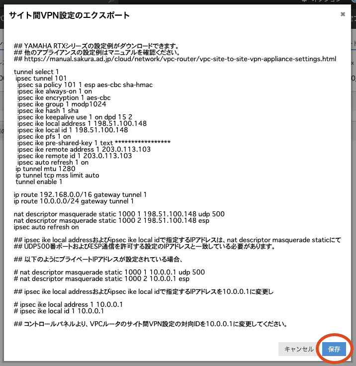 表示されている設定例をローカルPCに保存するには下の「保存」ボタンをクリックします。