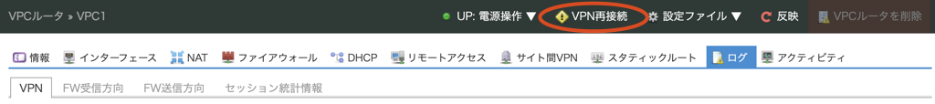 VPN接続にて、不具合が生じた場合、「VPN再接続」ボタンを押すことで、VPCルータを再起動せずにVPNのみ再接続することができます。