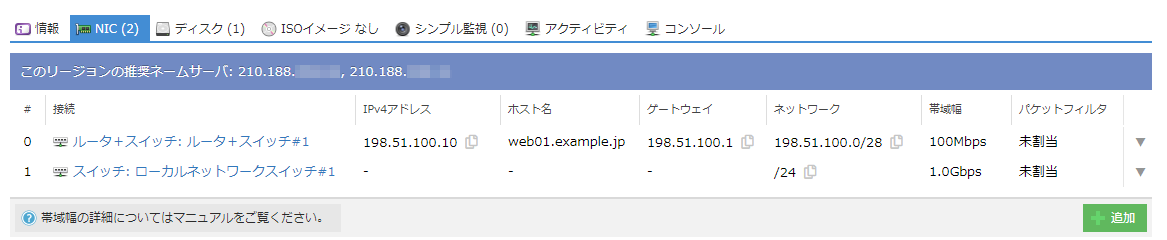 画面内では、搭載されているNICと接続先がリスト表示されます。詳細については NICの作成・削除 のページを参照ください。