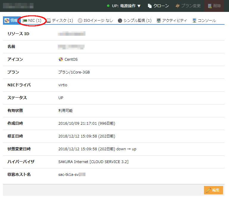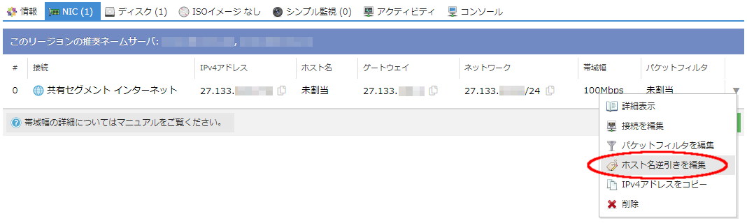 サーバに搭載されているNICがリスト表示されます。通常、グローバルIPアドレスが割り当てられるのは共有セグメントに接続される一番最初のNICとなるので、そのリスト右側の「▼」をクリックし、表示されたポップアップメニューより「ホスト名逆引きを編集」をクリックします。