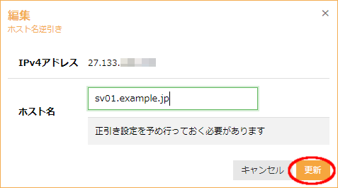 表示されたダイアログボックスに逆引きホスト名を入力し、更新ボタンをクリックします。