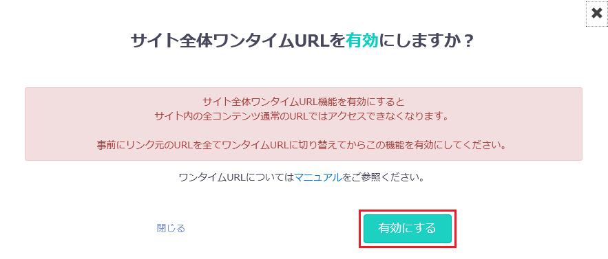 3. サイト全体ワンタイムURLを有効にしますか?の画面が開きますので、問題なければ「有効にする」ボタンをクリックします。