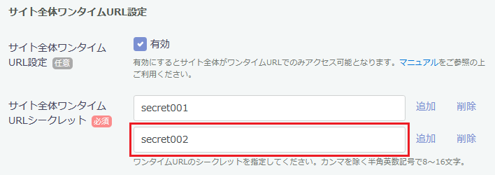 サイト全体ワンタイムURL設定 項目から古いシークレット「secret001」の削除をクリックします。