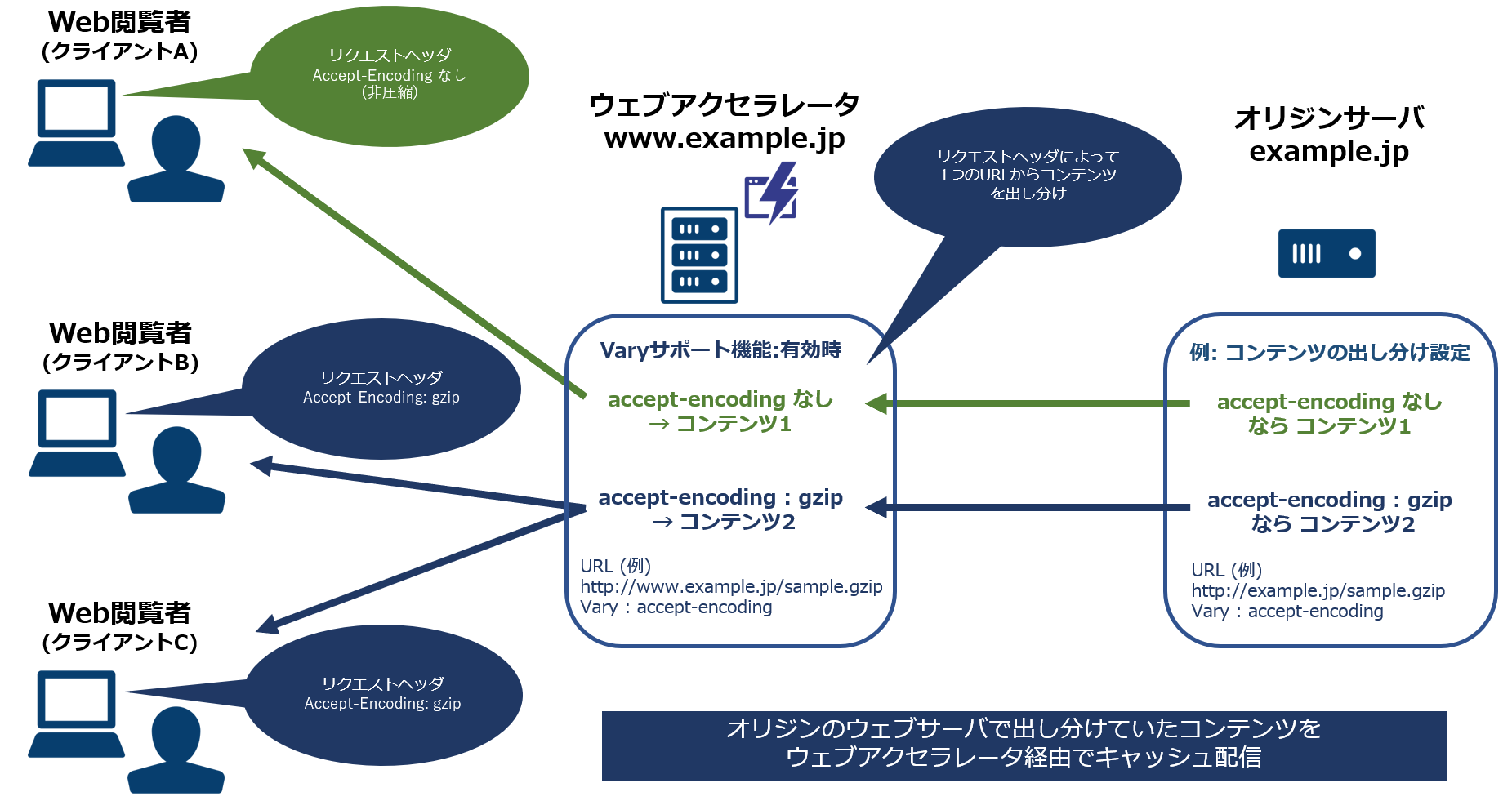 Varyサポート機能は、オリジンサーバ側のVaryヘッダの指定の仕方によってウェブアクセラレータのキャッシュヒット率が大幅に低下する可能性があります。前提条件及び設定内容をご理解の上でご利用いただくよう、お願いいたします。