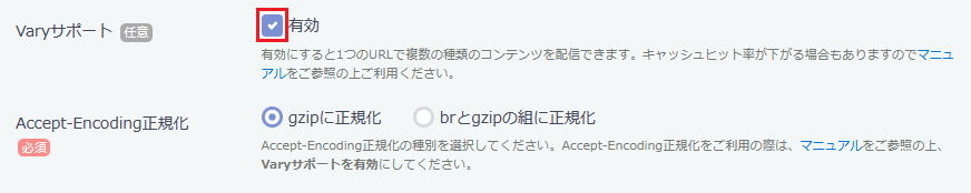 「Accept-Encoding正規化」をご利用の場合はVaryサポート機能を有効にしてください。また併せて オリジンサーバのレスポンスヘッダに、Varyヘッダの指定及び指定した内容に応じたコンテンツの出し分けの設定が必要です。