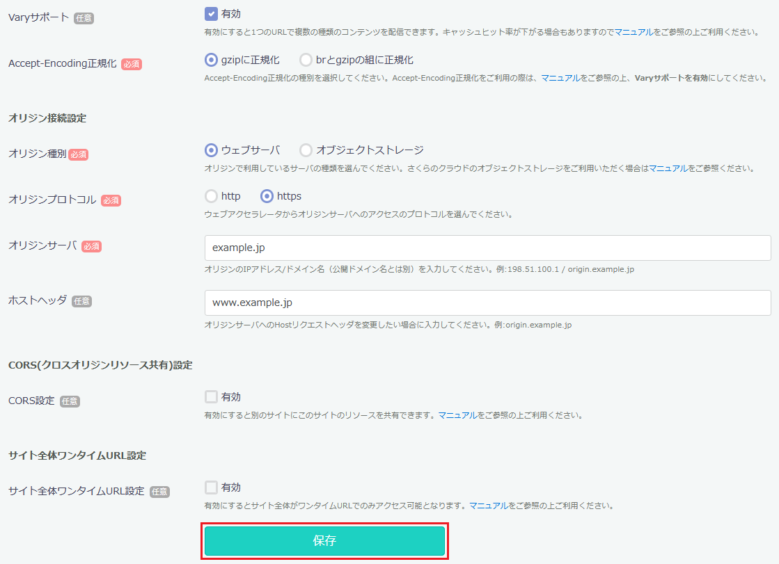 ※ Brotli での圧縮出し分けを行いたい場合は、 オリジンサーバ側でのVaryの指定例 のご確認の上、「Accept-Encoding正規化」項目で「brとgzipの組に正規化」を選択してください。