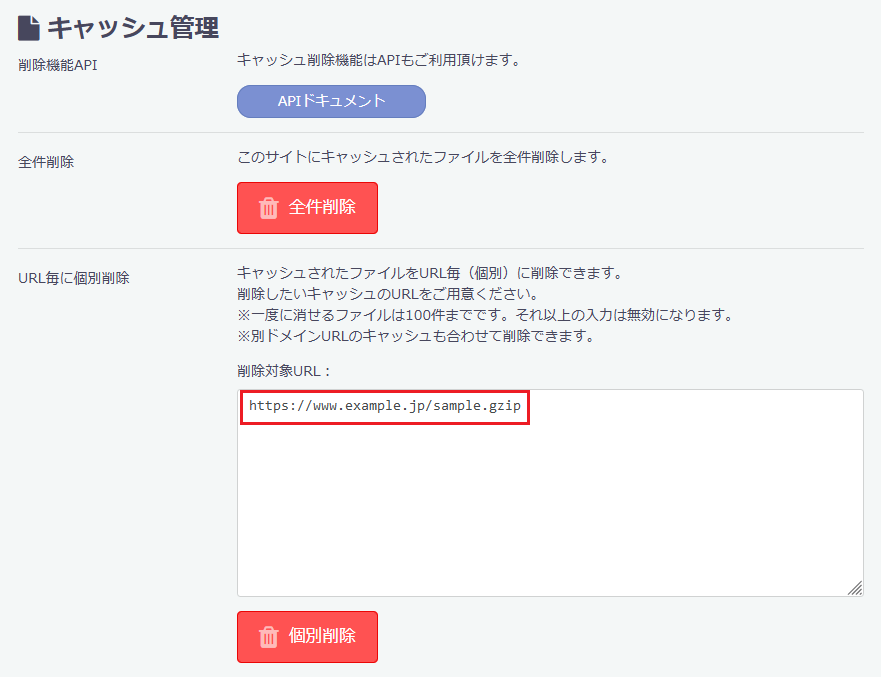 設定変更前の古いキャッシュが配信されてしまわないよう、キャッシュの削除を実行してください。(無効にする際にも行ってください)