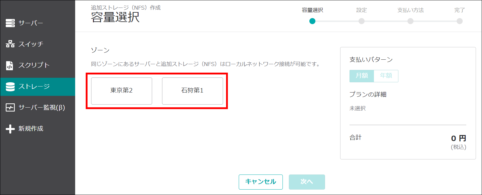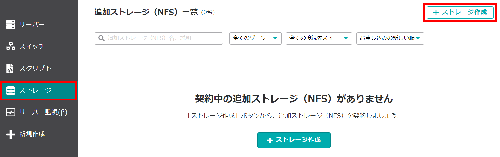 追加ストレージ(NFS)はローカルネットワークで接続するため「スイッチ」が必要です。また、追加ストレージ(NFS)とスイッチは、接続するサーバーと同一リージョンで作成してください。