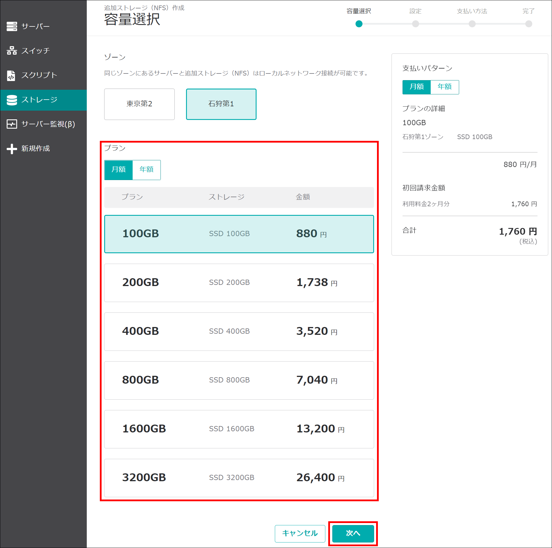 「プラン」を選択し、「次へ」をクリックします。