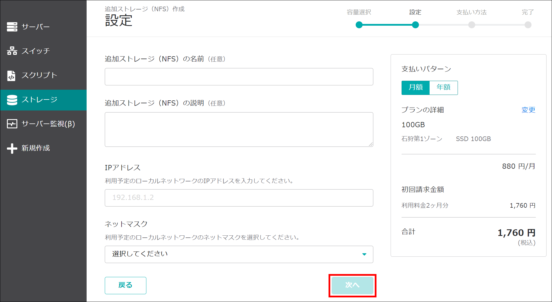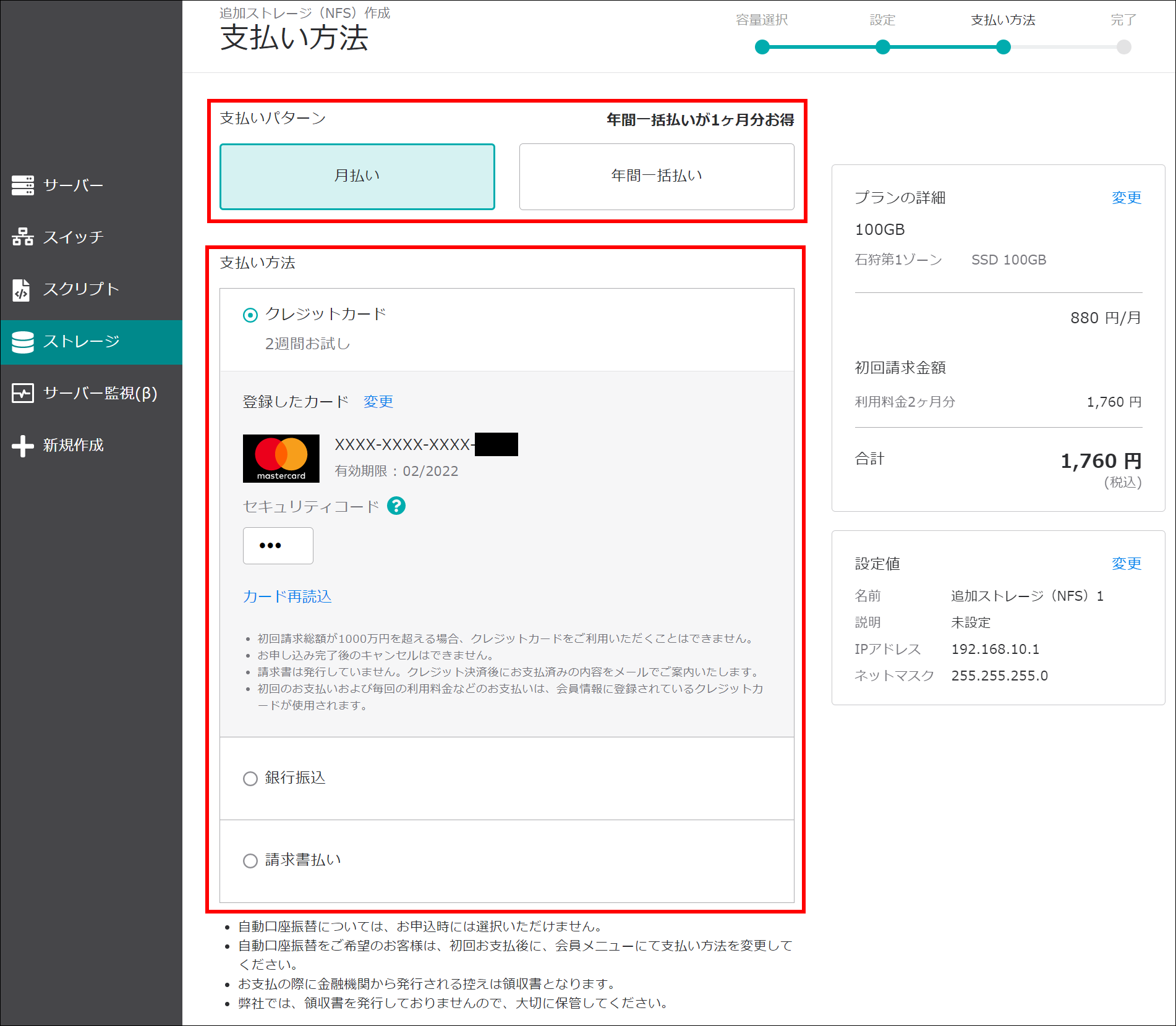 ※ 「銀行振込」「請求書払い」をご選択の場合、弊社にて入金が確認でき次第、追加ストレージ(NFS)が利用可能となりますのでご注意ください。入金が確認できるまでは「準備中」のステータスとなります。