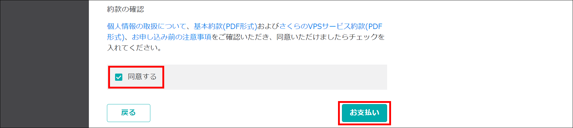 「約款の確認」をご確認いただき、内容に同意いただけましたら「同意する」にチェックを入れて「お支払い」をクリックします。