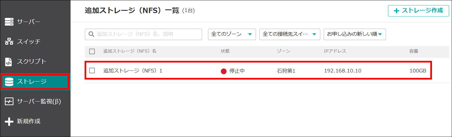 「ストレージ」を選択し、「ストレージ作成」をクリックします。