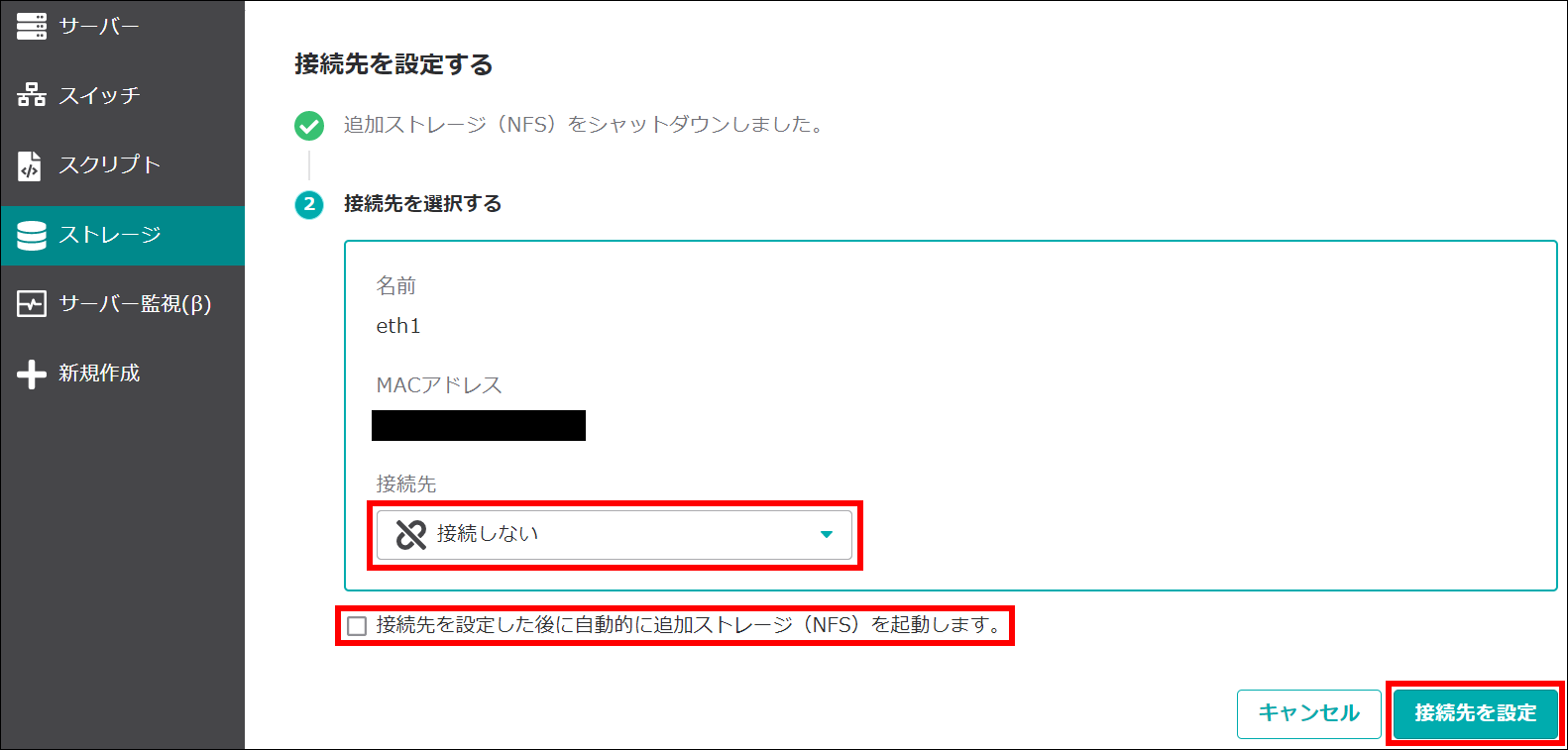 ※ 「接続先を設定した後に自動的に追加ストレージ(NFS)を起動します」にチェックを入れることで、設定後に状態が「稼働中」になります。