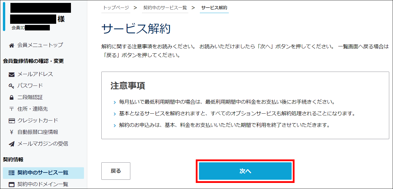 会員メニューの「サービス解約」で「次へ」をクリックしてお手続きください。