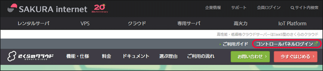 さくらのクラウド サービスサイト を開き、「コントロールパネルログイン」をクリックします。