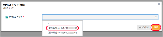 続いて、石狩のVPSスイッチを接続します。右下の「接続」をクリックします。