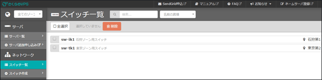 以下の例では、東京のVPSスイッチが1つ、石狩のVPSスイッチが1つ表示されています。