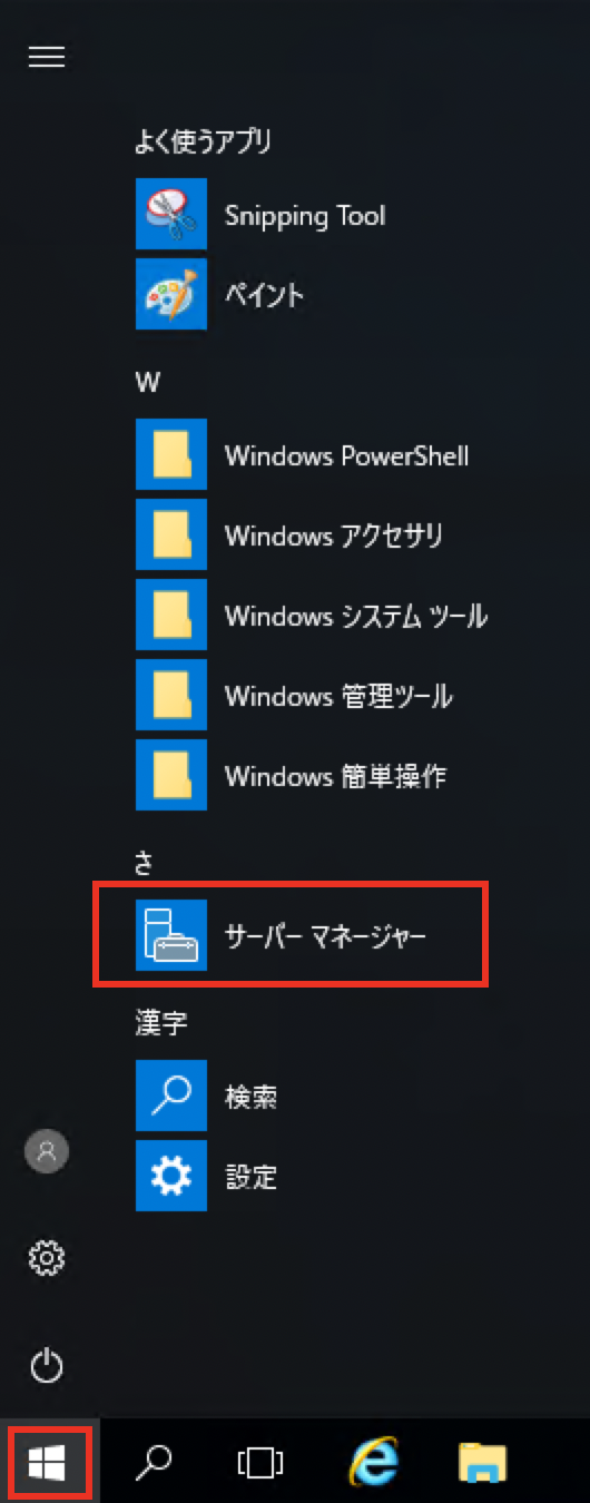 管理者権限を持つユーザ(Administrator など)でログインし、スタートメニューから「サーバー マネージャー」を起動します。