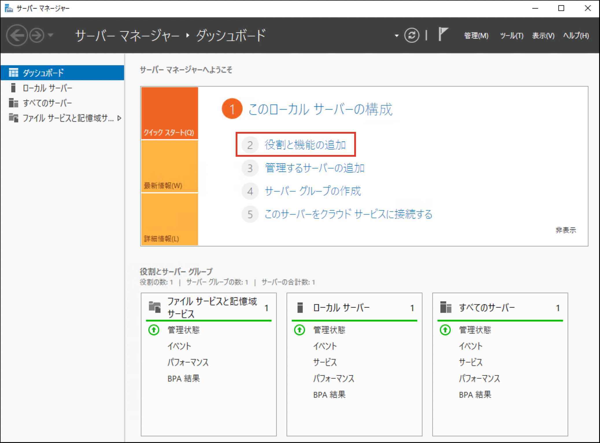 「ダッシュボード」の「役割と機能の追加」をクリックします。
