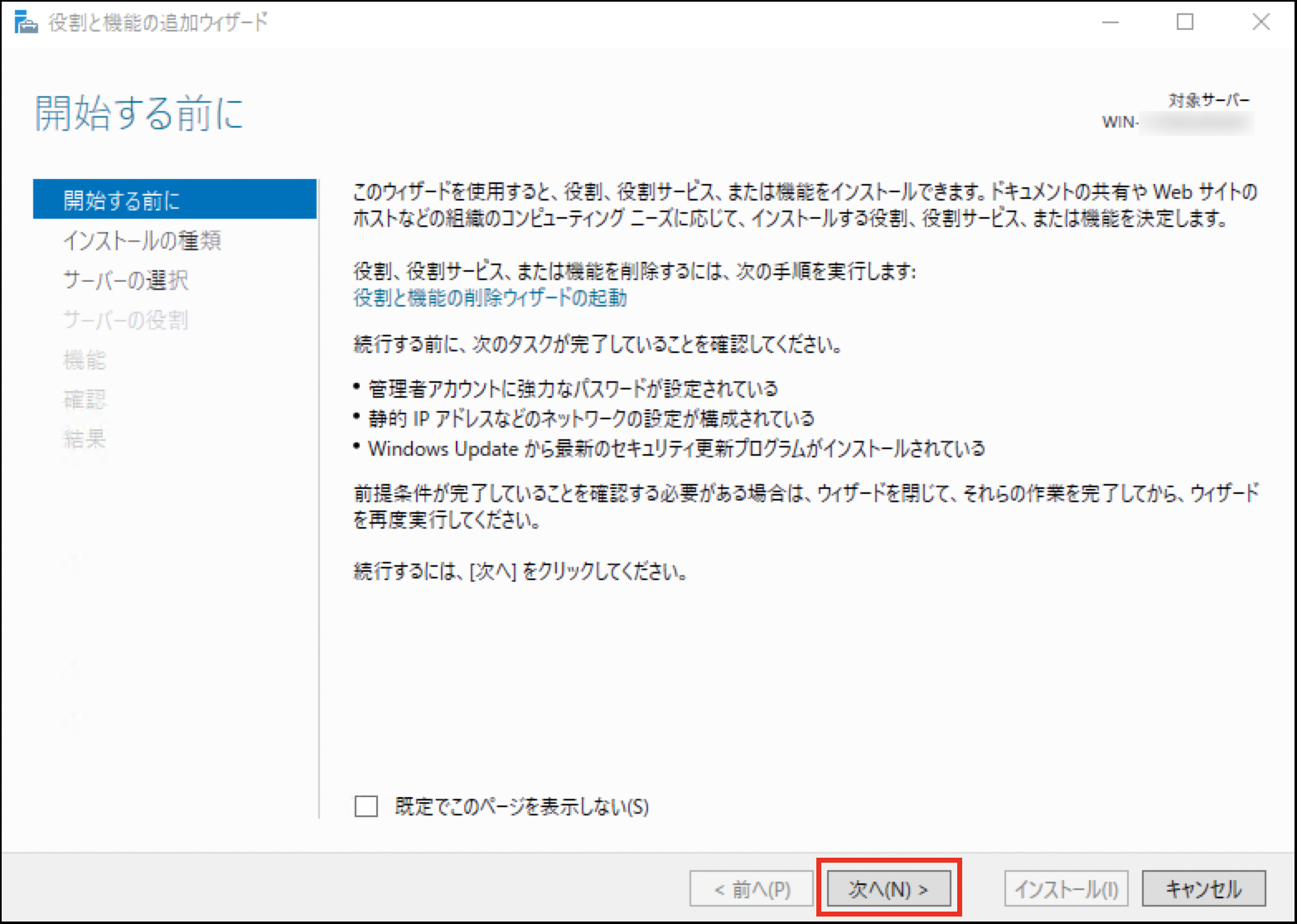 「役割と機能の追加ウィザード」が表示されます。「開始する前に」の内容を確認し、「次へ」をクリックします。
