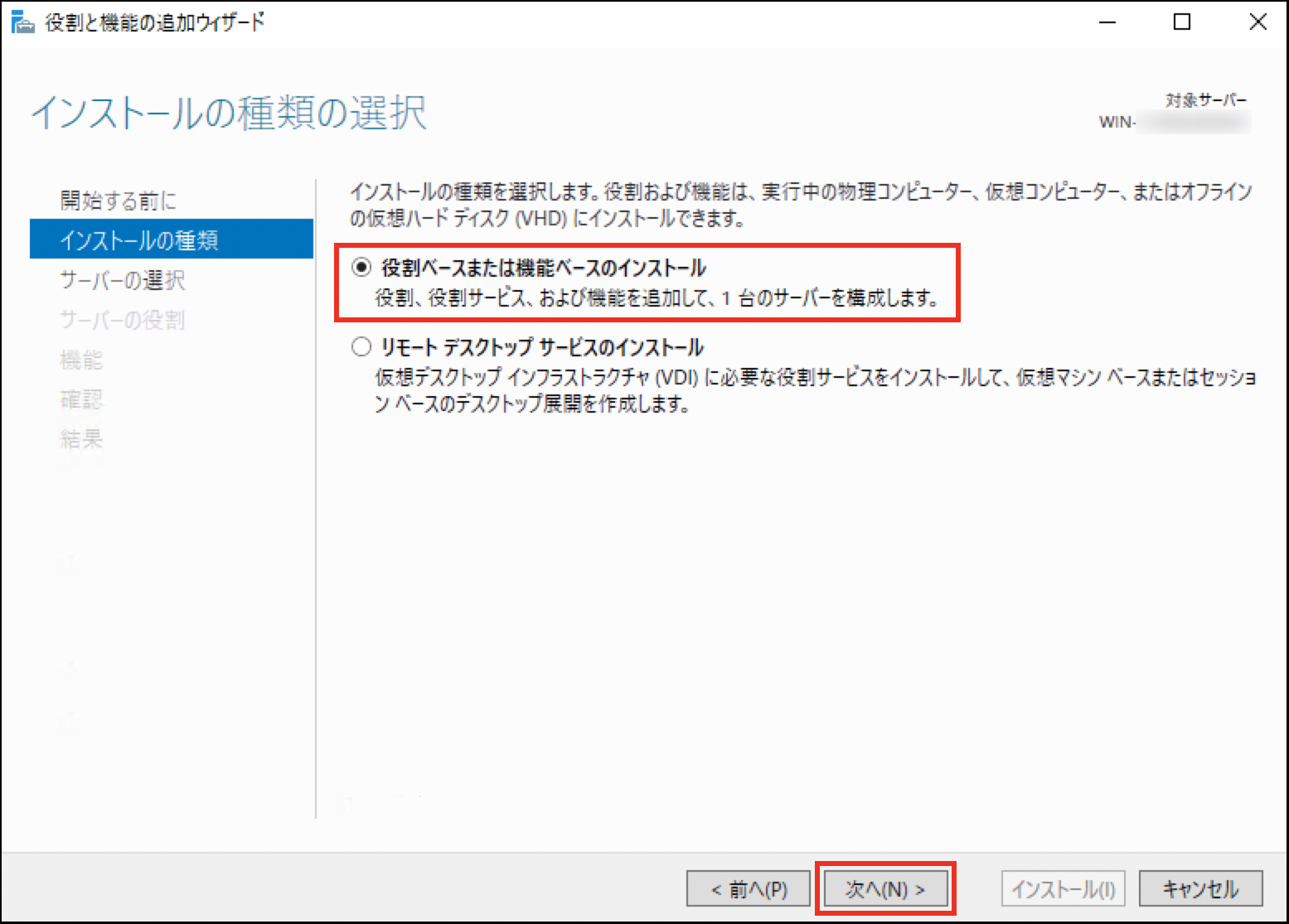 「インストールの種類の選択」で「役割ベースまたは機能ベースのインストール」が選択されていることを確認し、「次へ」をクリックします。