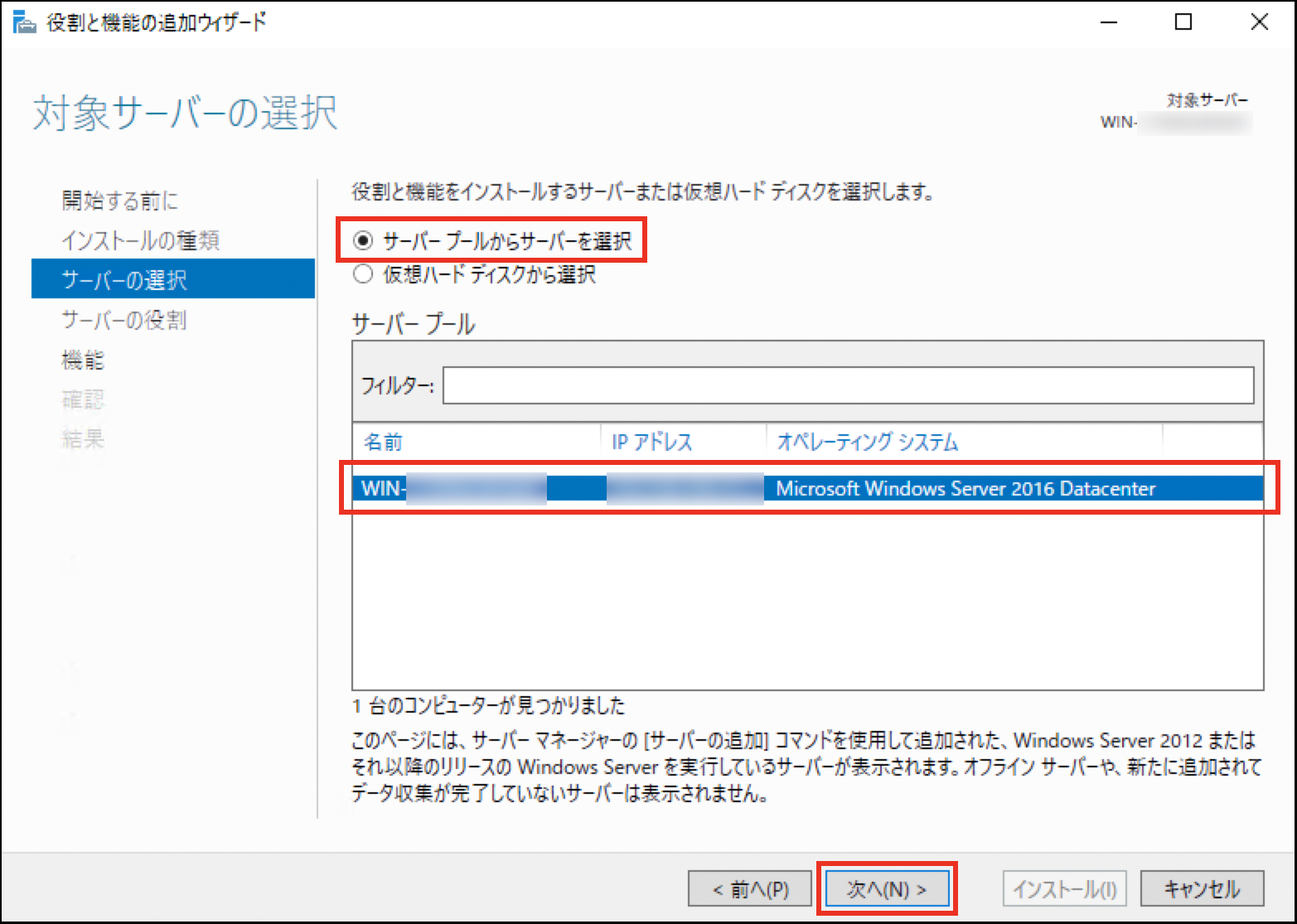 「対象サーバーの選択」で「サーバー プールからサーバーを選択」が選択され、下のリストで対象のサーバ(サーバーマネージャーで管理対象のサーバを追加していない場合は操作対象の自サーバ)が選択されていることを確認し、「次へ」をクリックします。