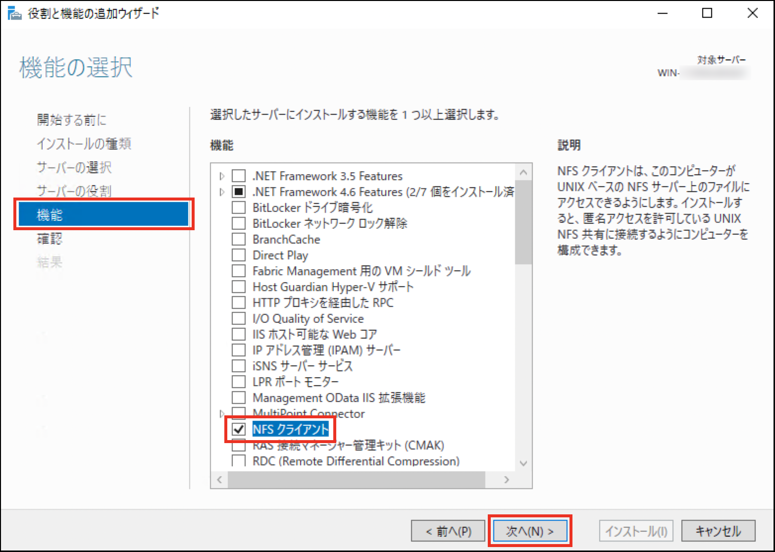 「サーバーの役割の選択」で左側の「機能」をクリックします。 右側のリストから「NFS クライアント」を選択し、チェックが入っている状態で「次へ」をクリックします。