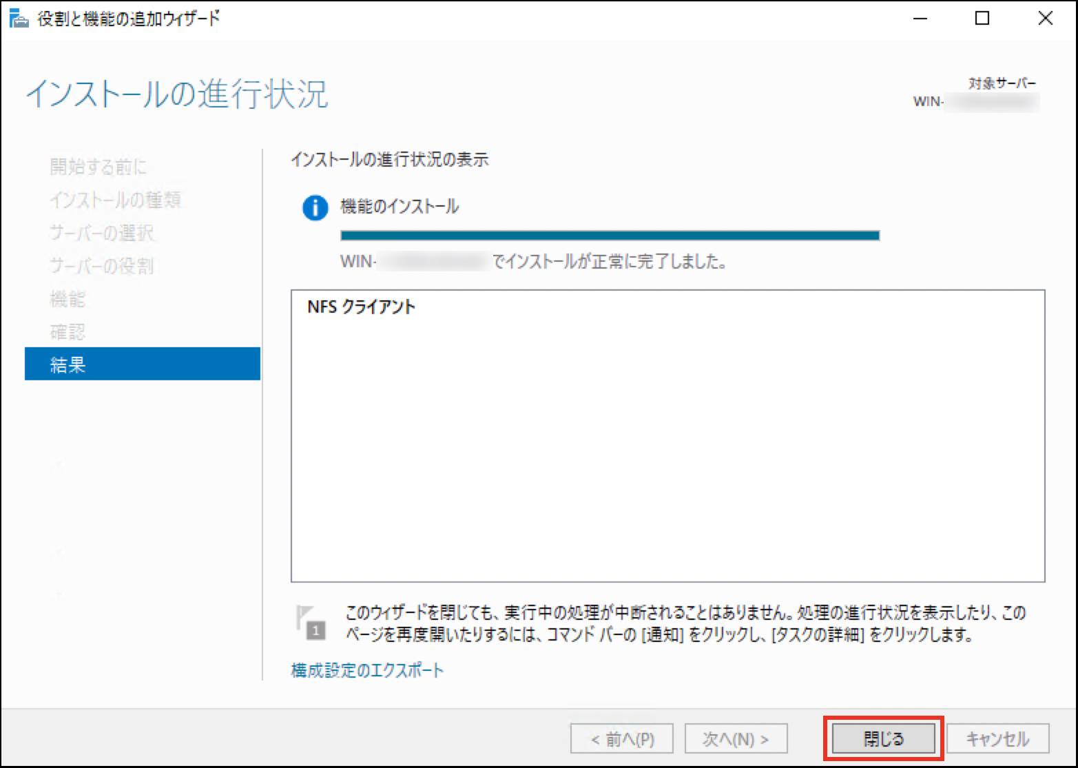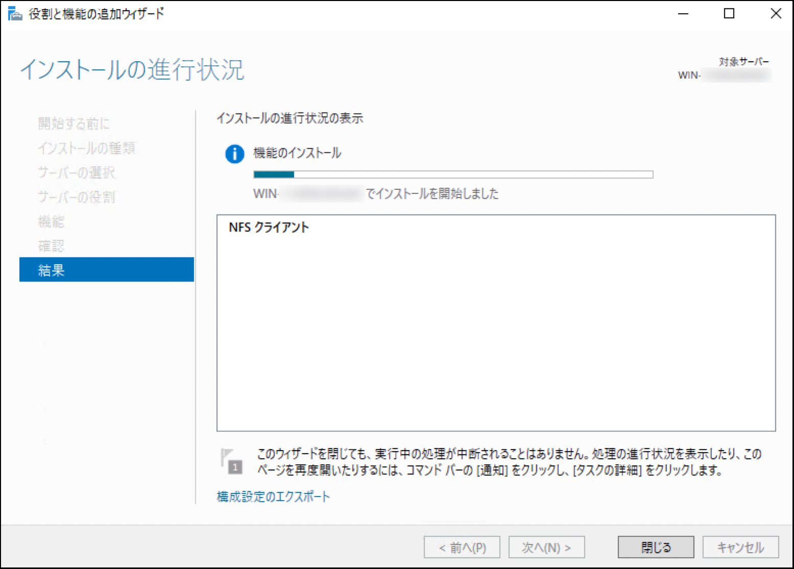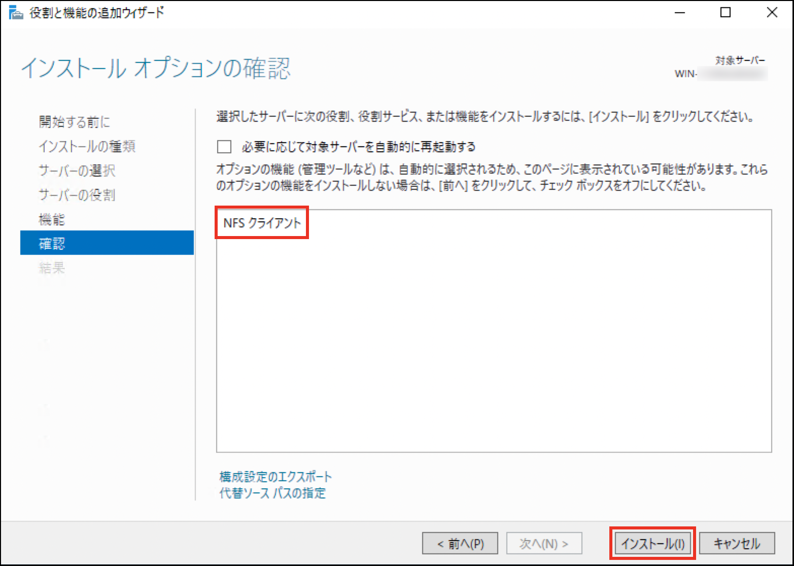 「インストール オプションの確認」で右側のエリアに「NFS クライアント」が表示されていることを確認し、「インストール」をクリックします。