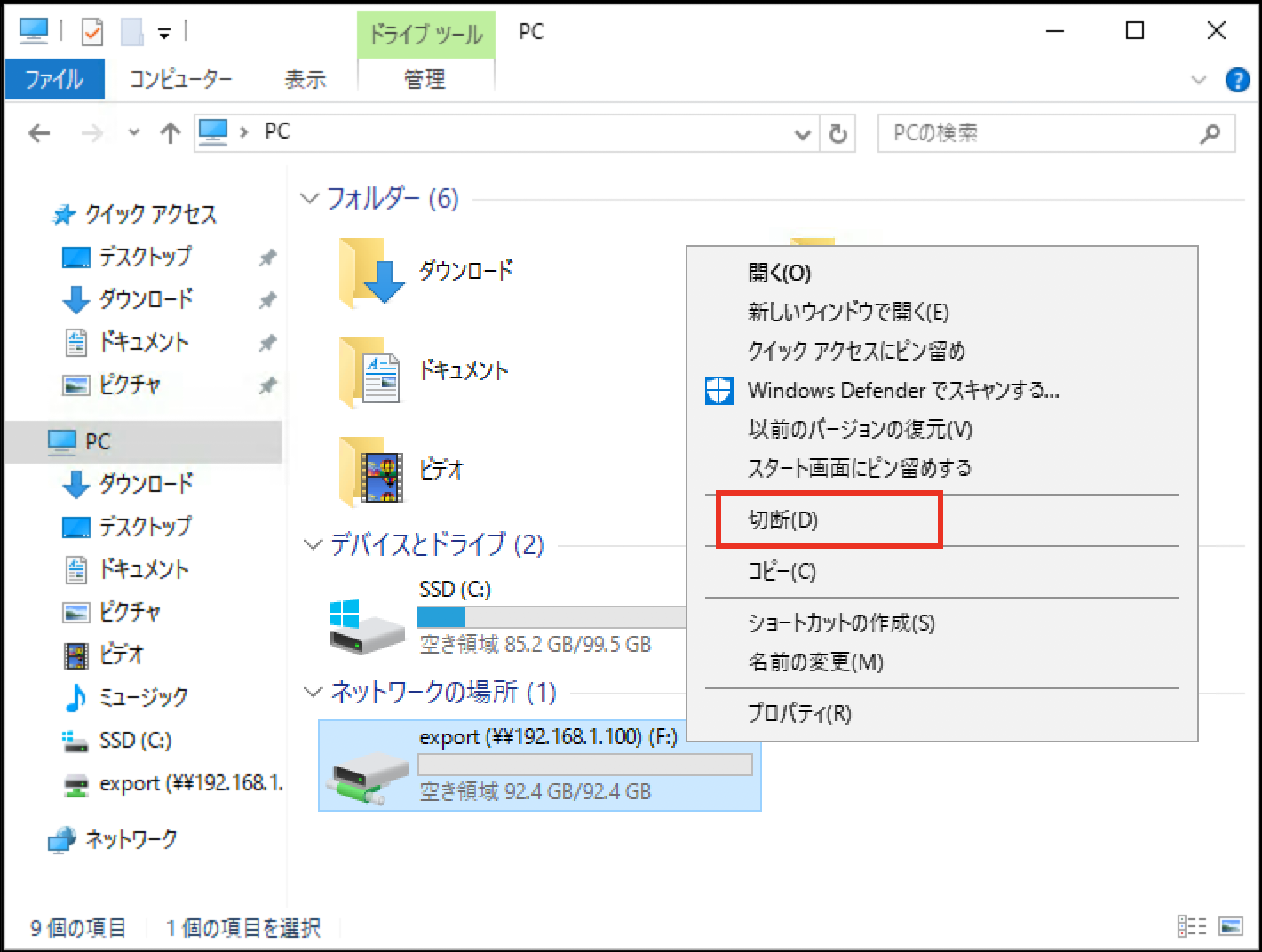 アンマウントする場合は、マウントされたドライブを右クリックして「切断」をクリックします。