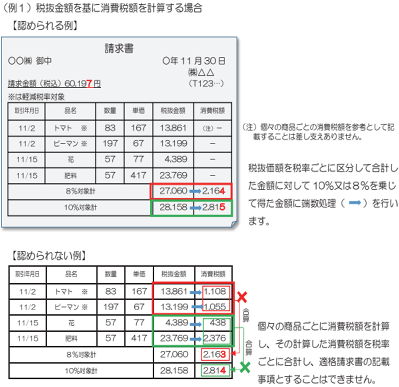標準税率対象と軽減税率対象が、1つの適格請求書上に両方存在する場合、税率ごとの合計金額それぞれに端数処理を 1回ずつおこなうルールが定められました。