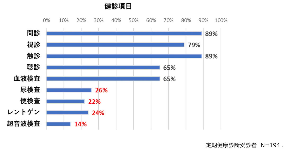 泌尿器や消化器、内臓疾患の発見に役立つ、尿検査・便検査・レントゲンはさらに割合が低く、いずれも 20%台の受診にとどまっています。