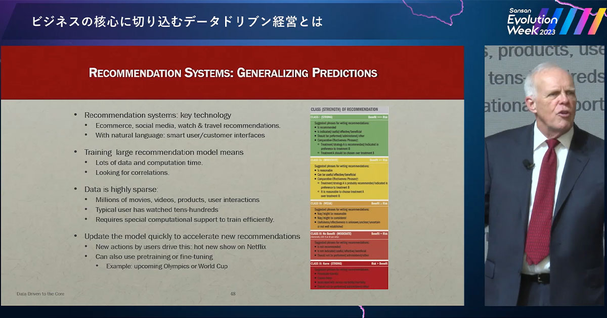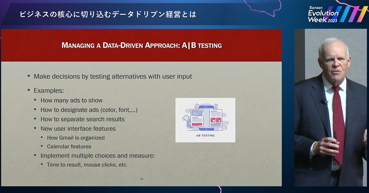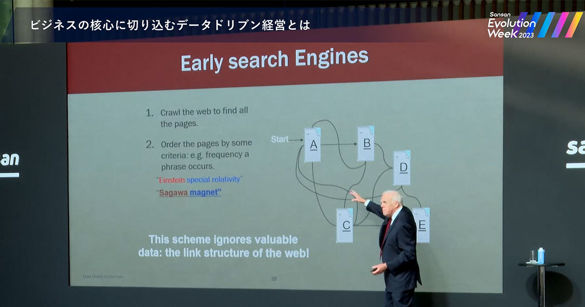 サービス設計やビジネスにおいて、データを徹底的に活用して意思決定をおこなっている Google。同社を世界のトップ企業へと成長させた、検索エンジンやメールなどの進化の背景や歴史、そして AI やデータの活用を通じて変革をもたらしたストーリーとは? Alphabet Inc. 現会長の ジョン・ヘネシー氏が語りました。