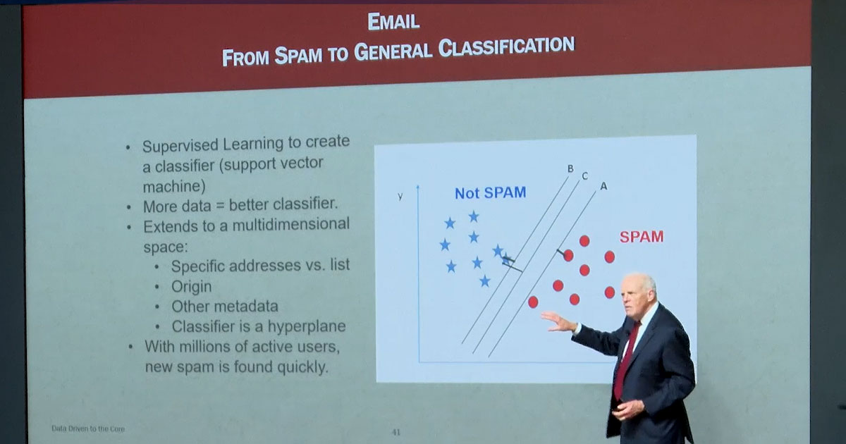 ビッグデータ活用の事例をご紹介します。Gmail では、非常に早い段階から迷惑メールフィルタを計画していました。すでに15年前の時点で、迷惑メールの増大が問題視されていたからです。