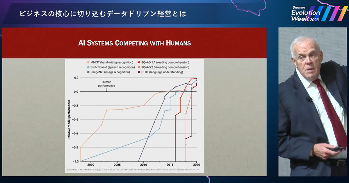 これは最近見つけた興味深いスライドです(上図)。黒い線は人間の性能を示し、すなわち人間の優位性を示しています。ここに示すさまざまなタスクについて、人間に比べ、AI がいかに優れているかがわかります。画像認識や手書き文字認識、音声認識などはすべて改善されています。