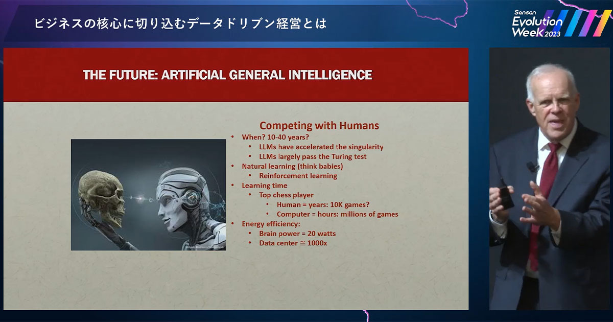 しかし人間の脳には、コンピューターには決して超えられない、素晴らしい強みが1つあります。私たちの脳は、20ワット程度のエネルギーしか消費しません。一方、システムは訓練のために、その1,000倍ものエネルギーが必要です。1,000倍も必要なのです! 私たちには、神や進化により与えられた効率性や創造性がある。それに匹敵するものなど存在しないのです。