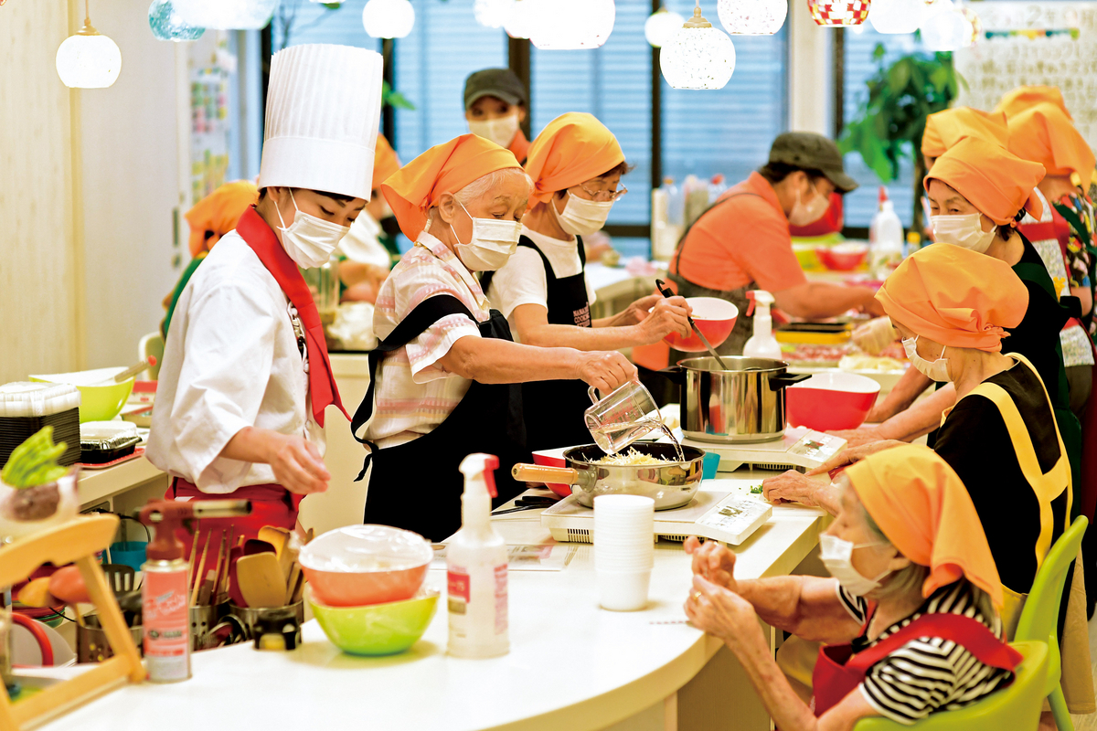 2015年に自由が丘にオープンした 1号店に足を踏み入れると、カラフルでおしゃれな内装に目を奪われる。色とりどりのエプロンを付けた高齢者が楽しげに料理をしていて、デイサービスだと言われなければ気づかない雰囲気だ。