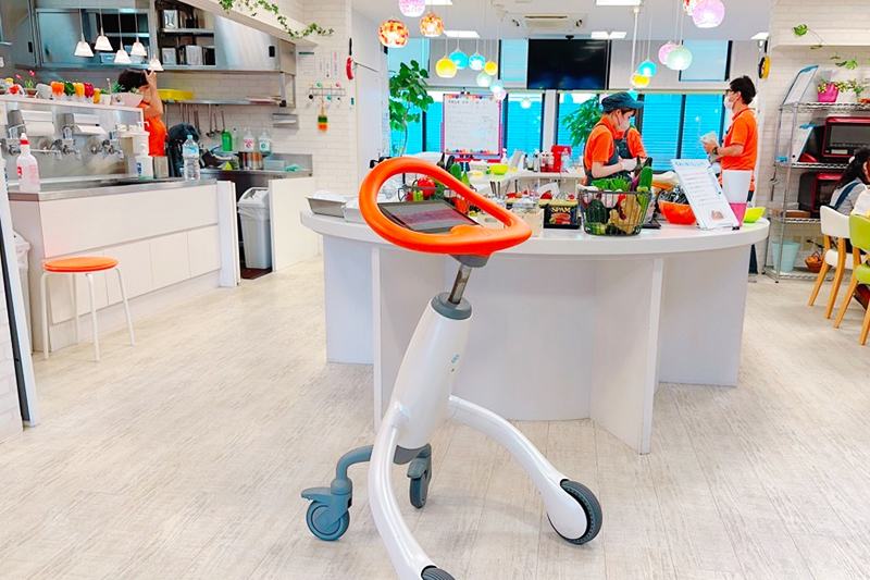 なないろクッキングスタジオ自由が丘では料理療法のほか、パナソニック社の最新の歩行トレーニングロボットによる歩行訓練もおこなっている。スリムでコンパクトな見た目のため場所を取らず、ハンドル部分は、デイサービスのビタミンカラーのインテリアによく馴染む鮮やかなオレンジ色だ。
