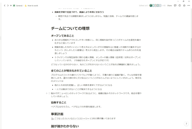 この体制は、同社の設立当初から一貫しているものだ。日々のコミュニケーションは「Slack」に一本化し、企業理念から社内の決定事項、ミーティングの議事録などは「Notion」に集約。定例会議も最低限に抑えられており、各自の判断で行動する時間のほうが圧倒的に長いのだ。