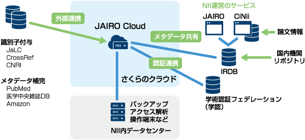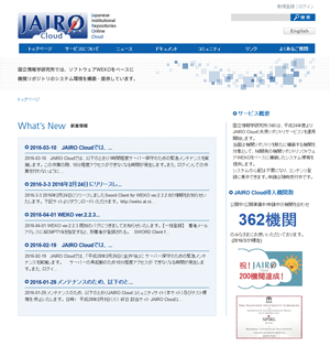 「JAIRO Cloud」は、学術情報(学術雑誌論文、学位論文、研究紀要、研究報告書)などを格納し、公開する機能を持つ「機関リポジトリ」のSaaSサービスです。大学や研究機関はJAIRO Cloud上で独立の機関リポジトリ環境を運用できます。同サービスは2012年4月から運用を開始し、当初NII内のプライベートクラウドで運用していました。その後、2015年11月にさくらのクラウドに移行しています。