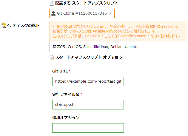 また、今回追加されたフォーム機能を活用したパブリックスクリプト”Git Clone”(スタートアップスクリプトID: 112600117316)を公開しました。フォームに入力したGitのURLをcloneし、指定の実行ファイルを自動的に実行します。