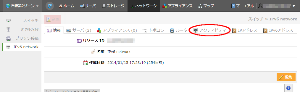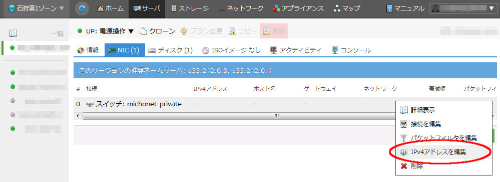 編集はサーバの詳細画面の「NIC」タブをクリックして表示されるインターフェイスリスト右側の「▼」ボタンをクリックし、ポップアップメニューから「IPv4アドレスを編集」を選択することで行うことが可能です。